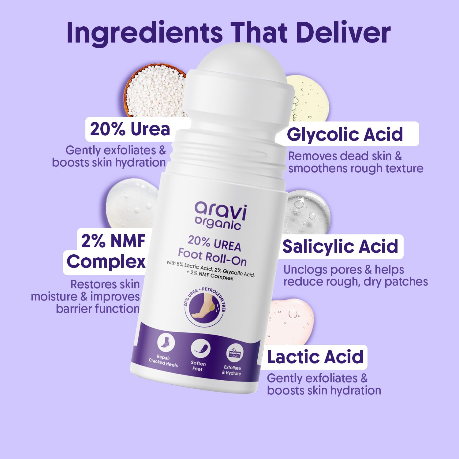Aravi Organic 20% Urea Foot Roll-On With 0.5% Salicylic Acid, 5% Lactic Acid, 2% Glycolic Acid & 2% NMF Complex -50ml