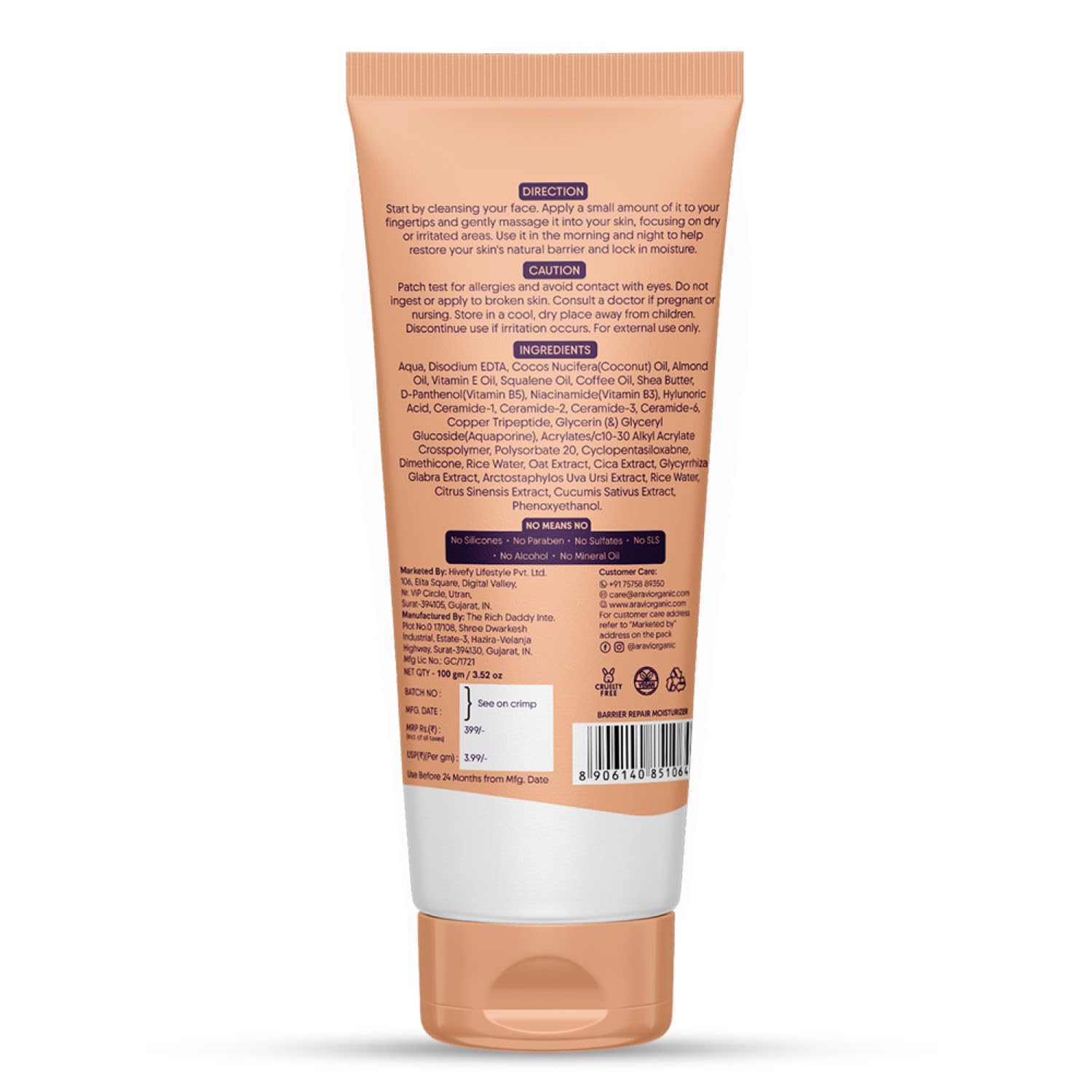 Aravi Organic Advanced Barrier Repair Moisturizer - With Ceramide, Peptide, Hyaluronic Acid & Cica-100 gm