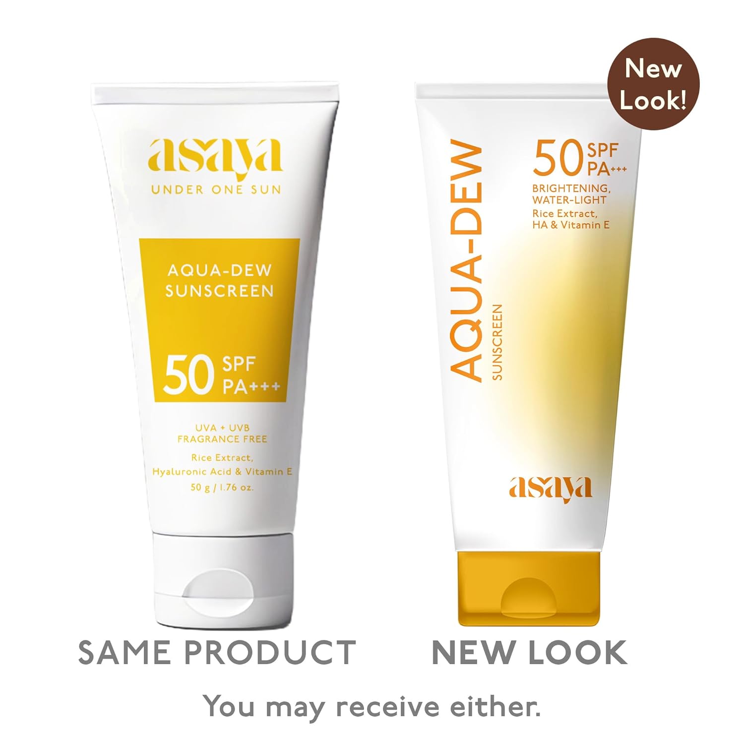 Asaya Aqua Dew Sunscreen delivers SPF 50 PA+++ broad-spectrum protection against UVA and UVB rays in an ultra-lightweight aqua gel formula. Infused with rice extract and hyaluronic acid, it brightens skin tone while providing hydration and antioxidant defense with vitamin E. The fast-absorbing, dewy finish leaves no white cast—ideal for hot, humid climates. Experience weightless sun protection with a radiant, supple complexion.