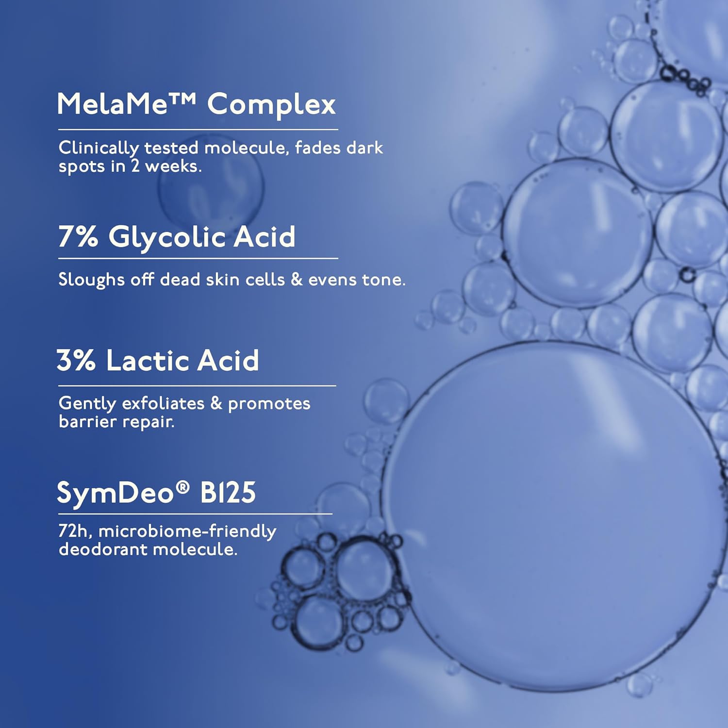 Asaya Even Tone Underarm Mist combines targeted brightening with odour control in one innovative formula. The 10% AHA blend—featuring 7% Glycolic Acid and 3% Lactic Acid—works synergistically with the proprietary MelaMe Complex to visibly reduce underarm discoloration and pigmentation. SymDeo B125 deodorant active provides up to 72 hours of freshness, ensuring confidence throughout your day. The ultra-light, quick-drying mist absorbs without residue or clothing marks, making it ideal for continuous use. Dermatologically tested and formulated without parabens, silicones, or sulphates, this treatment respects even the most sensitive underarm skin while delivering professional-grade results.