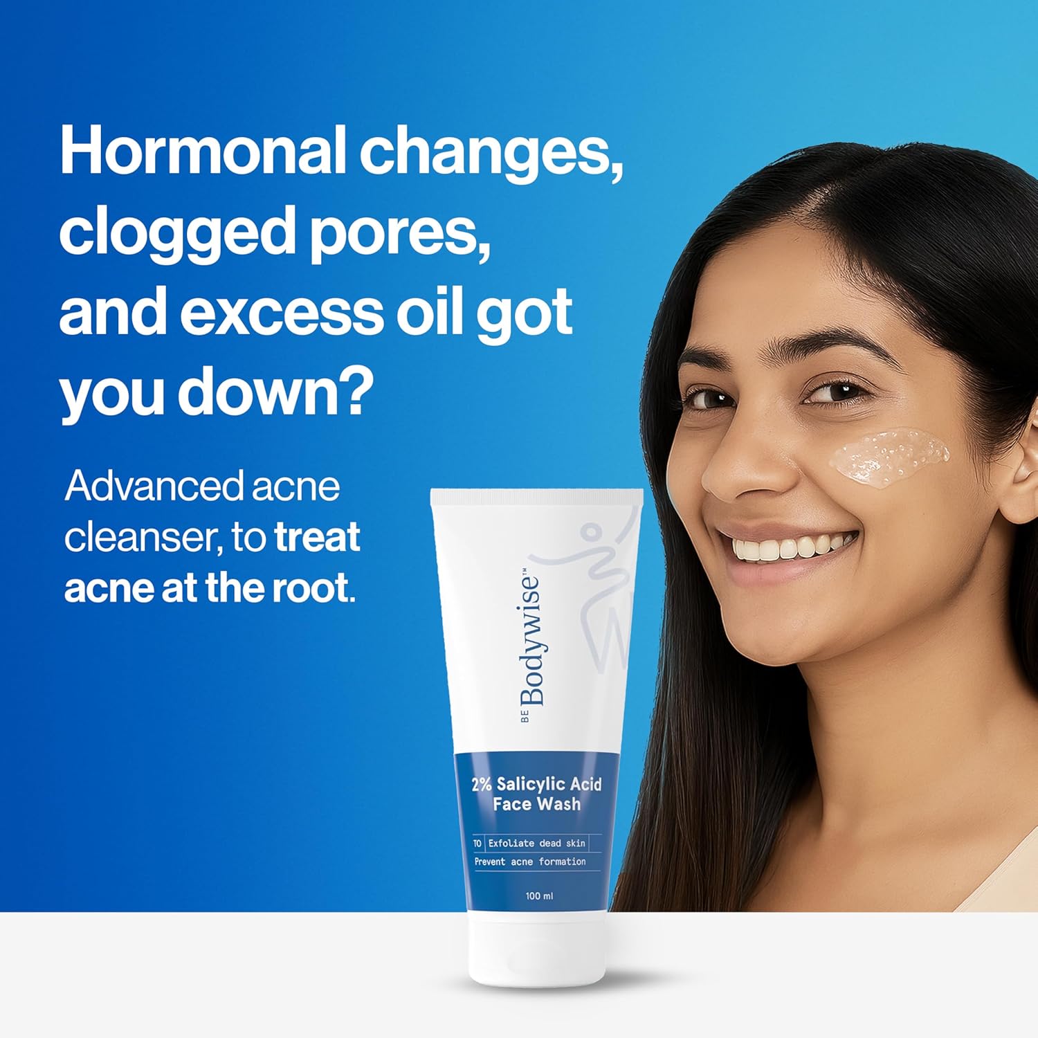 Be Bodywise 2% Salicylic Acid Face Wash is expertly formulated to deep cleanse and exfoliate skin by removing dead cells, excess oil, and impurities. Its 2% salicylic acid content unclogs pores, controls sebum, and helps prevent acne and blackheads while minimizing pore appearance. Enriched with allantoin, it soothes inflammation and redness, promoting calm, balanced skin. This dermatologist-recommended, gel-based face wash is free from parabens, SLS, and alcohol, ensuring a gentle yet effective cleansing experience suitable for sensitive skin.