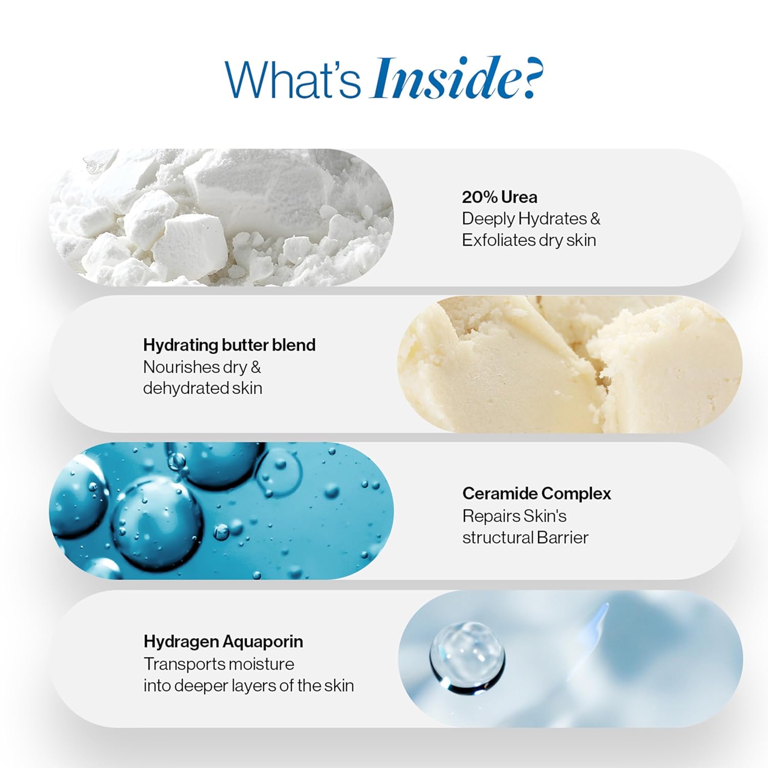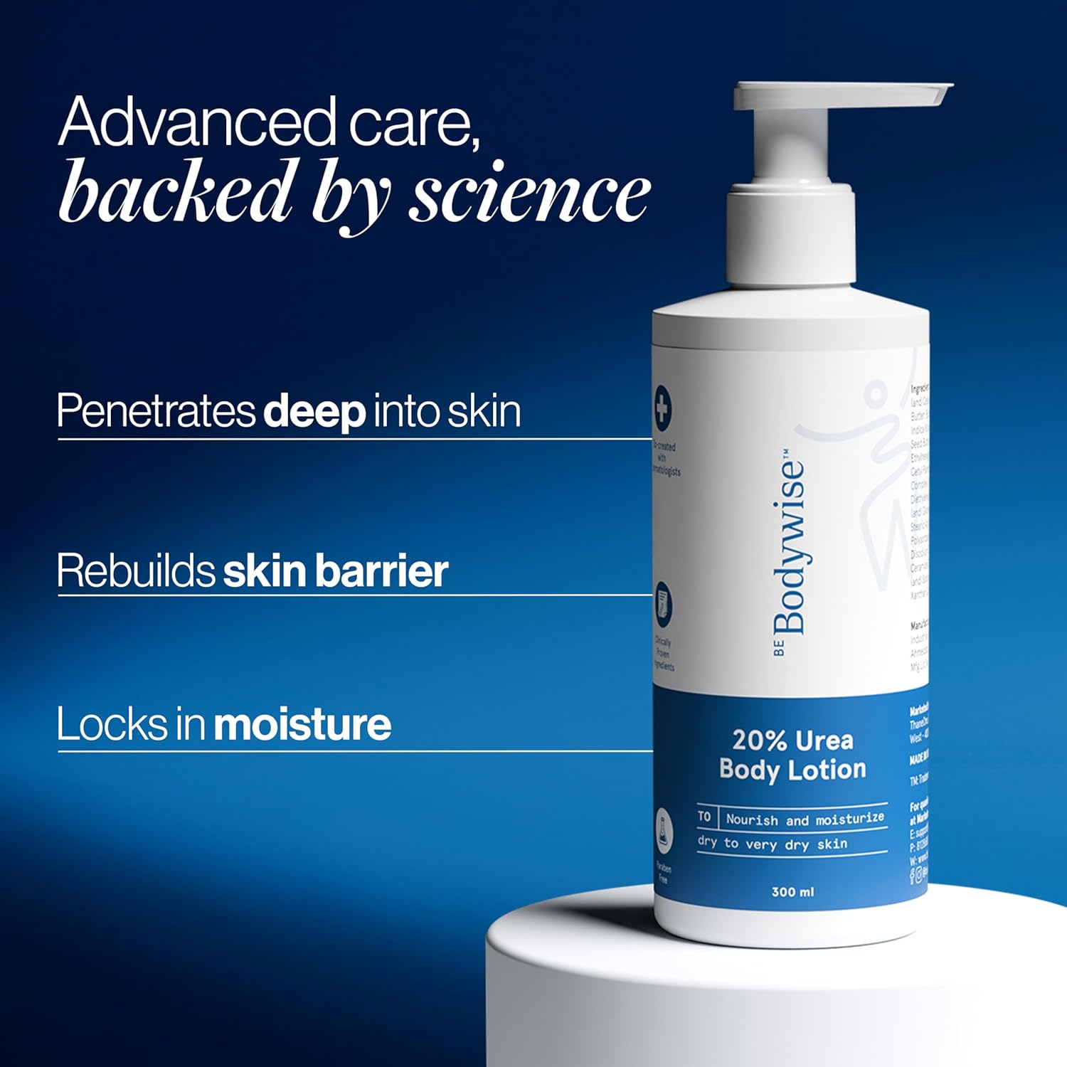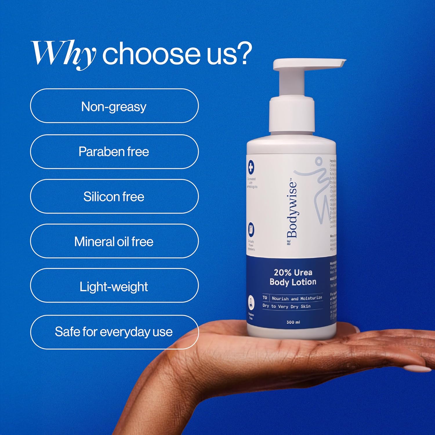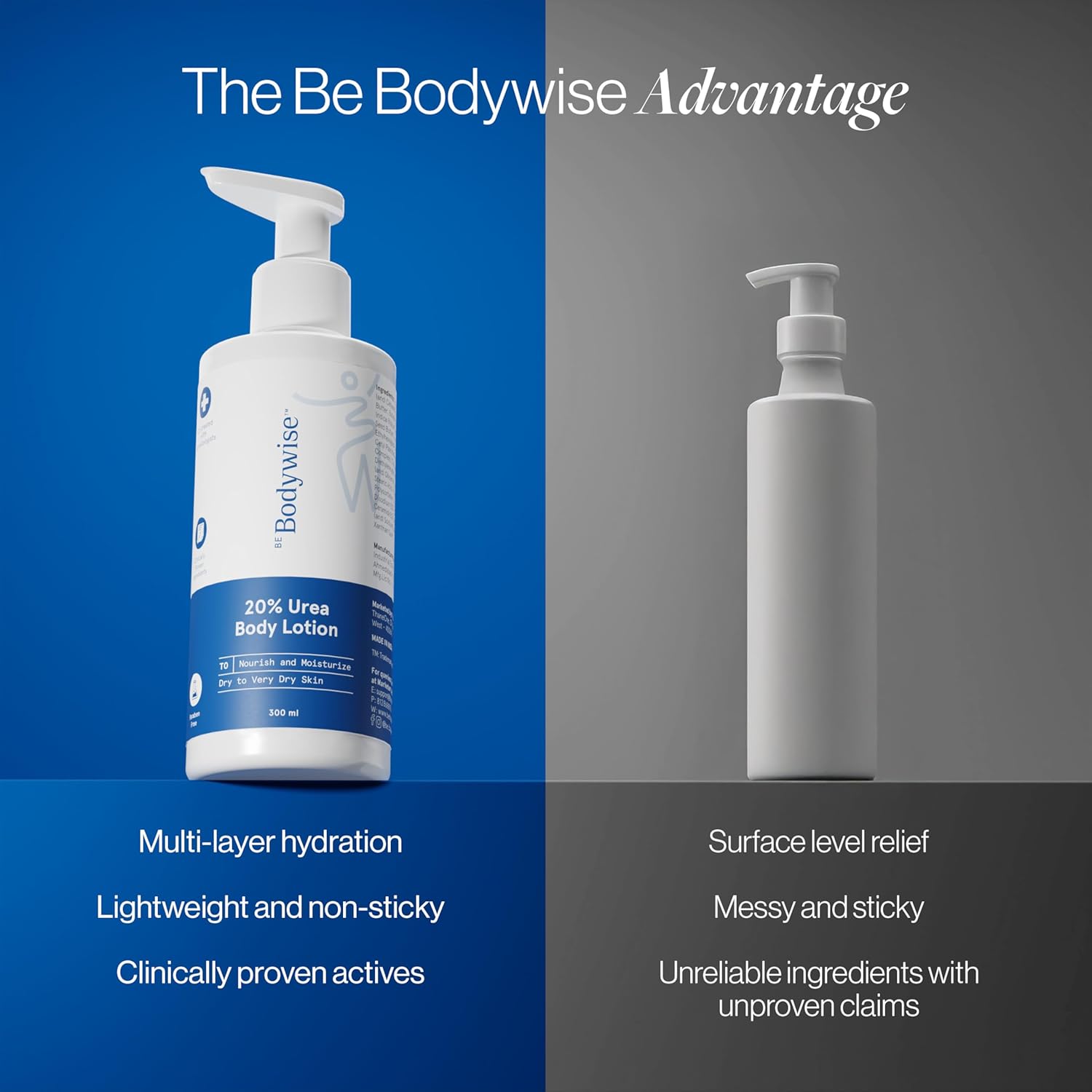 Be Bodywise 20% Urea Body Lotion is your solution for severely dry and flaky skin that demands intensive care. With 20% urea, this advanced formula delivers 48-hour hydration, penetrating deep to soften even the most stubborn dryness. Ceramides work to repair and strengthen your skin's natural barrier, while a luxurious blend of shea, mango, and kokum butters—18% emollients total—soothes irritation and nourishes from within. The lightweight, non-greasy formula absorbs quickly, making it ideal for daily use without any sticky residue. Experience lasting relief and restore your skin's natural softness and smoothness.