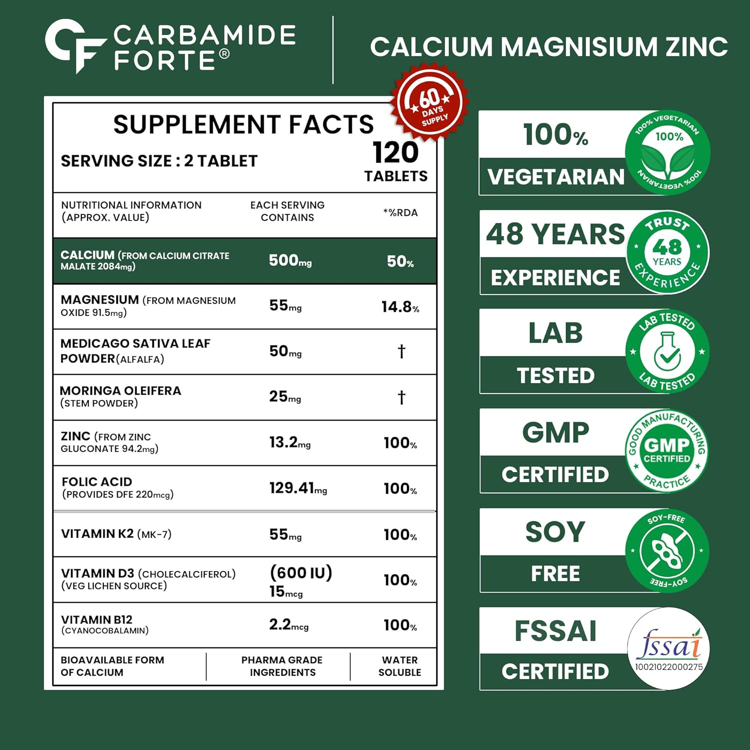 Carbamide Forte Calcium and Vitamin D3 Tablets deliver 1042 mg of Calcium Citrate Malate per serving, a highly absorbable form superior to standard calcium carbonate. This advanced formulation combines calcium with Vitamin D3, zinc, and magnesium to optimize mineral uptake and support bone health. The water-soluble calcium citrate malate minimizes bloating and prevents unwanted calcium deposits, making it ideal for sustained daily supplementation. Designed for both men and women seeking comprehensive skeletal support, these tablets provide a gentle yet effective approach to maintaining calcium levels and overall bone density without digestive discomfort.