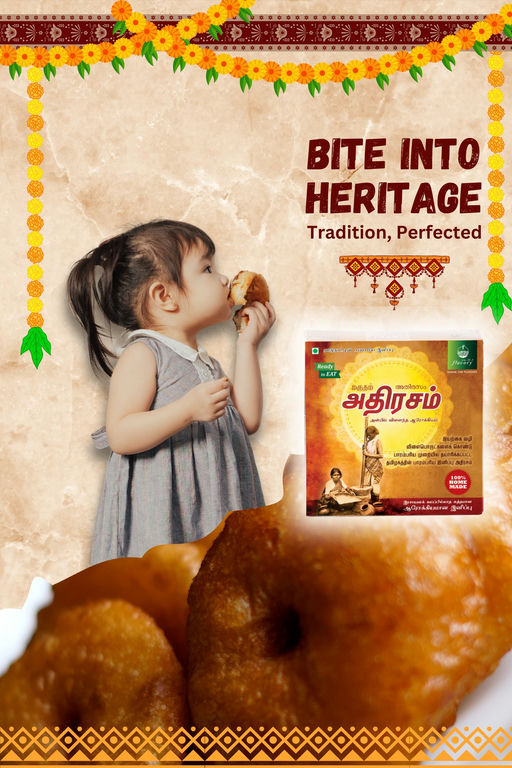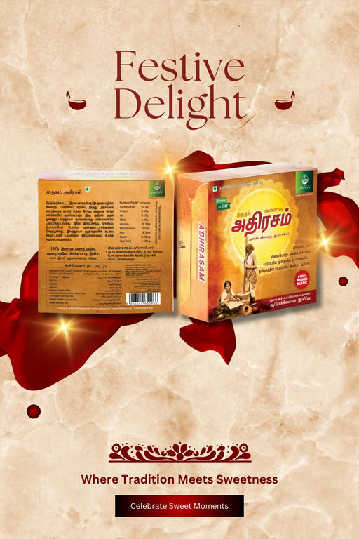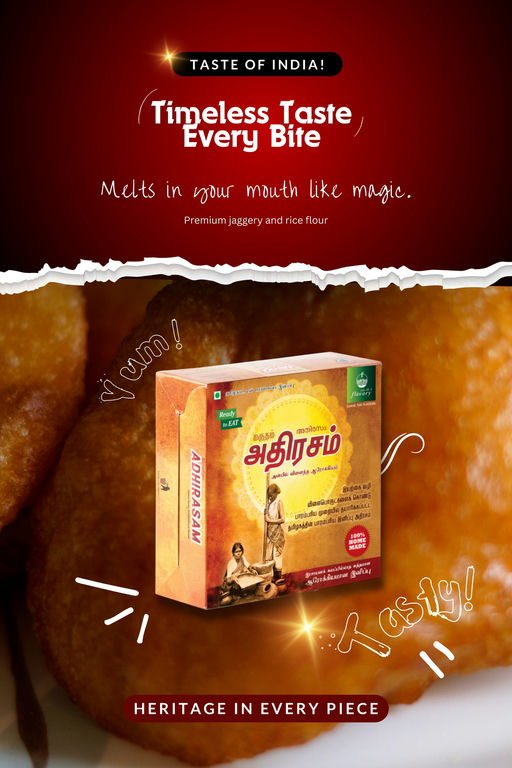 Flavory Adhirasam is a traditional South Indian sweet that blends rice flour and jaggery to create a crispy, golden treat. Known as the Indian doughnut, it is deep-fried to perfection, giving it a crispy outer layer while maintaining a soft, chewy center. Handcrafted using authentic methods, this sweet offers a unique flavor with the perfect balance of sweetness from jaggery. Ideal for festivals, celebrations, or as a special indulgence, Flavory Adhirasam brings the rich culinary heritage of South India to your table.