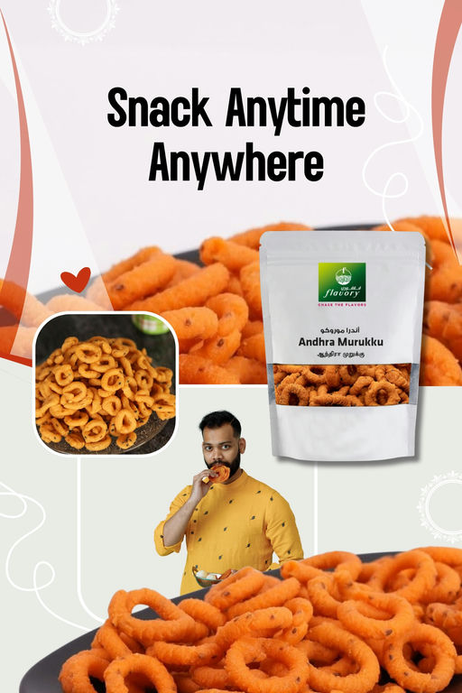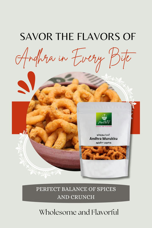 Flavory Andhra Murukku is a delicious, traditional South Indian snack made with rice flour and a blend of spices, inspired by the authentic flavors of Andhra Pradesh. Known for its crispy texture and savory taste, this murukku is deep-fried to golden perfection, offering a satisfying crunch with every bite. Handcrafted using traditional methods, it captures the true essence of Andhra cuisine. Ideal for tea time, festivals, or as a light snack, Flavory Andhra Murukku brings the authentic taste of South India to your home.