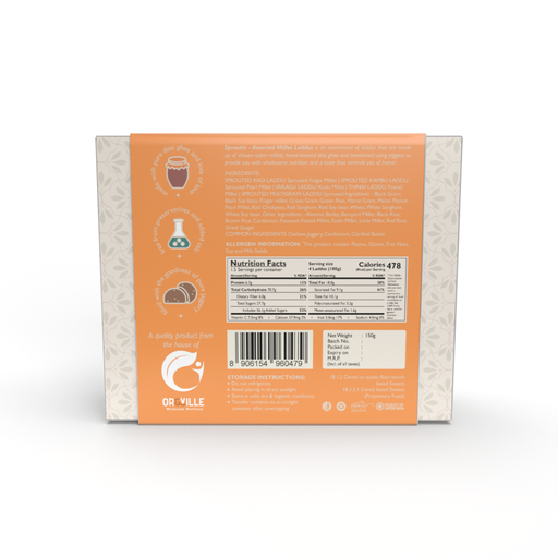 Flavory Assorted Millet Laddu is a healthy snack made with a blend of mixed millets, pure ghee, and jaggery, offering a unique and nutritious treat. Combining the goodness of different millets like ragi, foxtail, and kodo, this laddu provides a rich source of fiber, protein, and essential nutrients. Handcrafted using traditional methods, it brings together the earthy flavors of millets with the sweetness of jaggery for a delicious and wholesome snack. Perfect for health-conscious individuals, Flavory Assorted Millet Laddu is ideal for festive occasions or as a nutritious snack anytime.