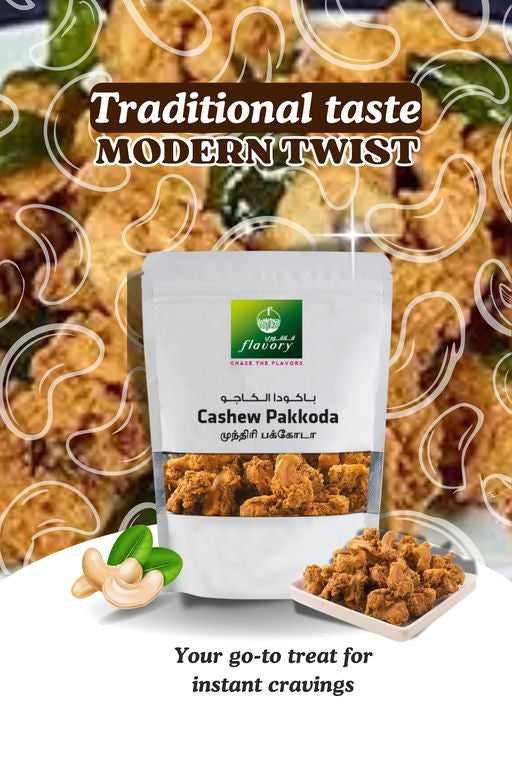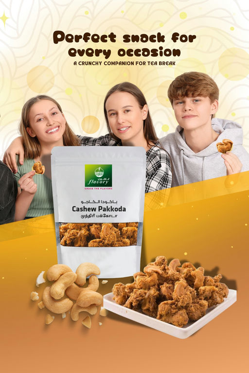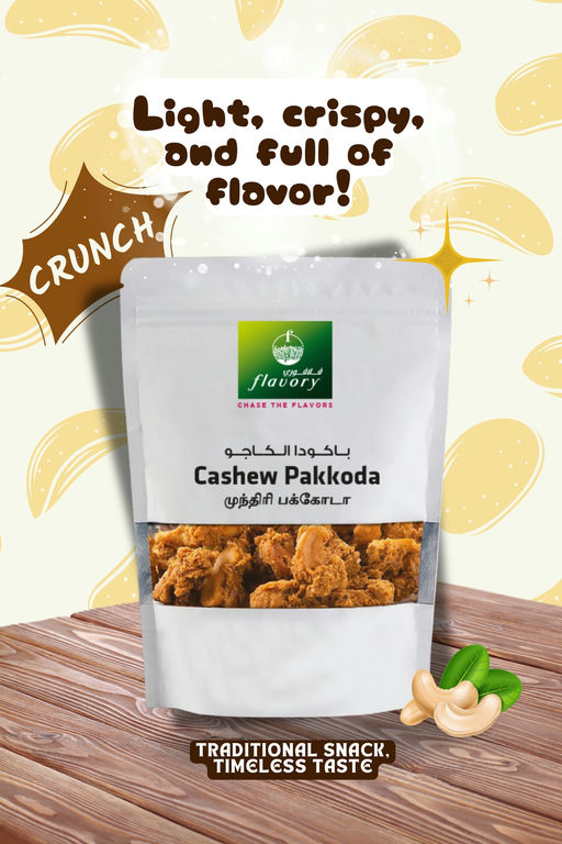 Flavory Cashew Pakkoda is a crunchy and savory South Indian snack made with cashews, gram flour, and a blend of aromatic spices. The cashews add a rich, nutty flavor while the gram flour gives it a crispy texture, making it a perfect snack for any time of the day. Deep-fried to golden perfection, this pakkoda offers a delightful balance of savory spices and the goodness of cashews. Handcrafted with traditional methods, it’s ideal for enjoying during tea time, festivals, or as a light snack. Flavory Cashew Pakkoda brings the authentic taste of South India to your home.