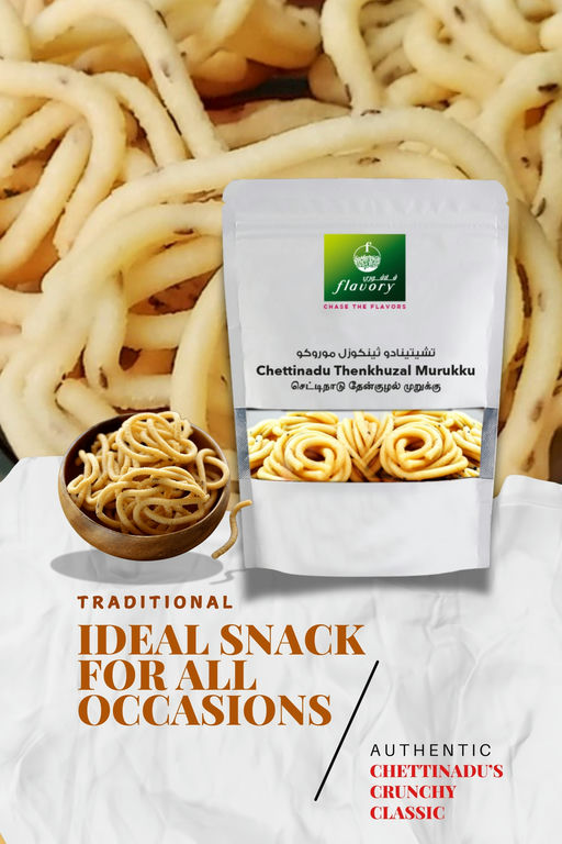 Flavory Chettinadu Thenkuzhal Murukku (Chettinad Crispy Rice Snack), Traditional South Indian Snack Made with Rice Flour & Spices, Crispy & Savory, 100g