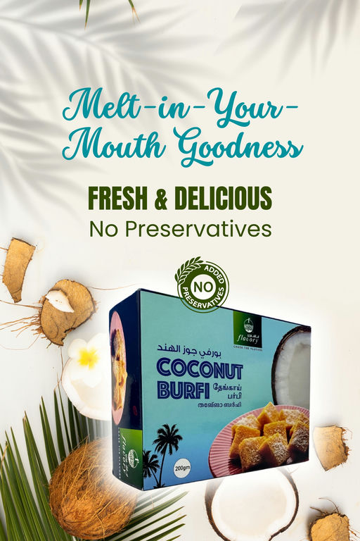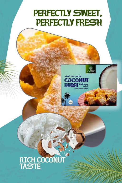 "Flavory Coconut Burfi is a delectable Indian sweet made with fresh, grated coconut and sugar, offering a rich and aromatic flavor. Handcrafted using traditional methods, this burfi has a soft, chewy texture and the perfect balance of sweetness. It's a popular treat for festivals, celebrations, or as a special indulgence. Whether you enjoy it with family or gift it to loved ones, Flavory Coconut Burfi brings the authentic taste of India to your table.