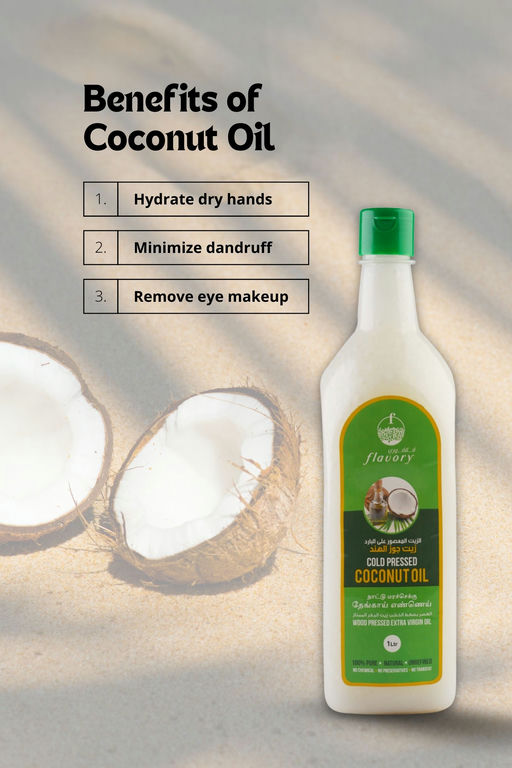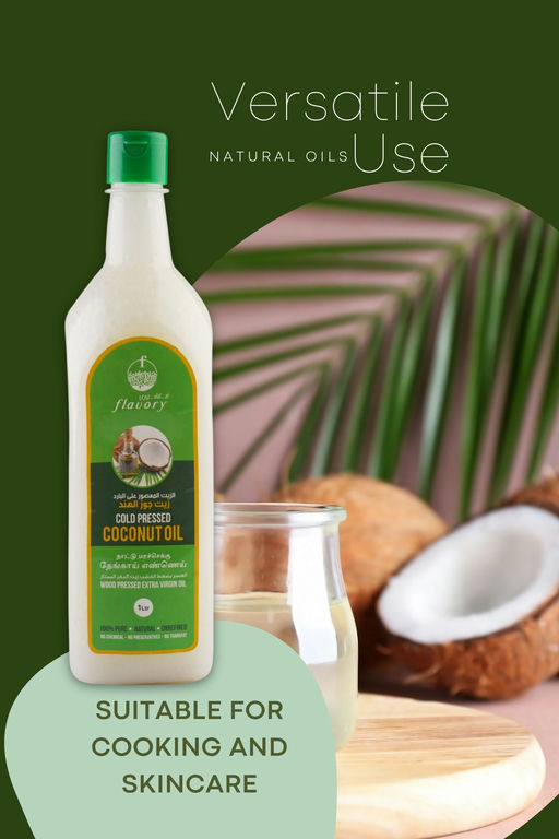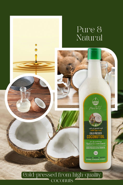 Flavory Cold Pressed Coconut Oil is a premium, pure oil extracted using the traditional cold pressing method, ensuring that all the natural nutrients and flavors of coconut are retained. This versatile oil is perfect for both cooking and skincare. Rich in healthy saturated fats, it offers a high smoke point, making it ideal for frying, sautéing, and baking. Additionally, its nourishing properties make it an excellent choice for hair care, skin moisturizing, and as a natural beauty product. Packaged in a 1-litre bottle, it’s a must-have for every home.