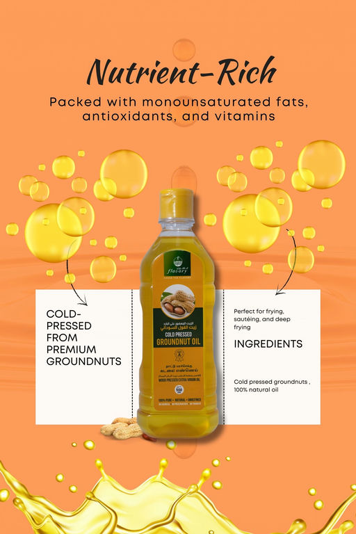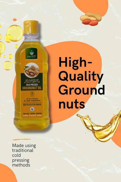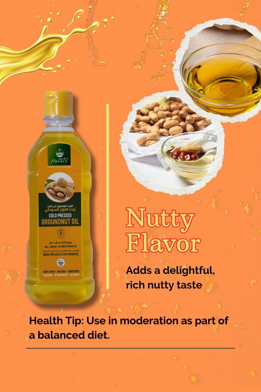 Flavory Cold Pressed Groundnut Oil is a premium, pure, and natural oil extracted using traditional cold pressing methods. This oil retains all the essential nutrients and natural flavors of groundnuts, making it an excellent choice for healthy cooking. Rich in monounsaturated fats, it offers a high smoke point, making it ideal for frying, sautéing, and deep frying. Flavory Cold Pressed Groundnut Oil adds a delightful nutty flavor to your dishes, while providing a healthy and wholesome cooking experience. Packaged in a 1-litre bottle, this oil is a must-have for every kitchen.