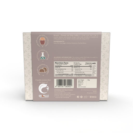 Flavory Flax Seed & Dates Laddu is a healthy snack packed with the goodness of flax seeds and dates, blended with pure ghee and jaggery. Rich in omega-3 fatty acids, fiber, and antioxidants, flax seeds offer numerous health benefits, while dates provide natural sweetness and energy. This laddu combines the nutritious qualities of these superfoods with the traditional flavors of ghee and jaggery, creating a delicious and wholesome treat. Ideal for health-conscious individuals, Flavory Flax Seed & Dates Laddu is perfect for any occasion or as a daily snack.