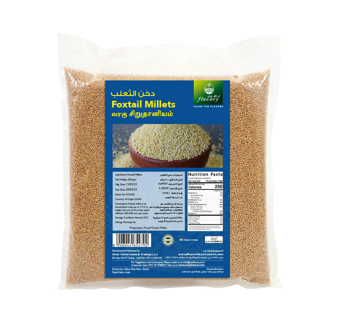 Flavory Foxtail Millet (Thinai) is a highly nutritious whole grain, known for its impressive health benefits, including being rich in fiber, protein, and essential vitamins and minerals. This gluten-free millet is ideal for improving digestion, boosting energy levels, and supporting heart health. Foxtail millet is versatile and can be used in a variety of dishes such as porridges, pilafs, salads, and even baked goods. The 500g pack is perfect for those looking to incorporate a healthy, wholesome grain into their daily meals.