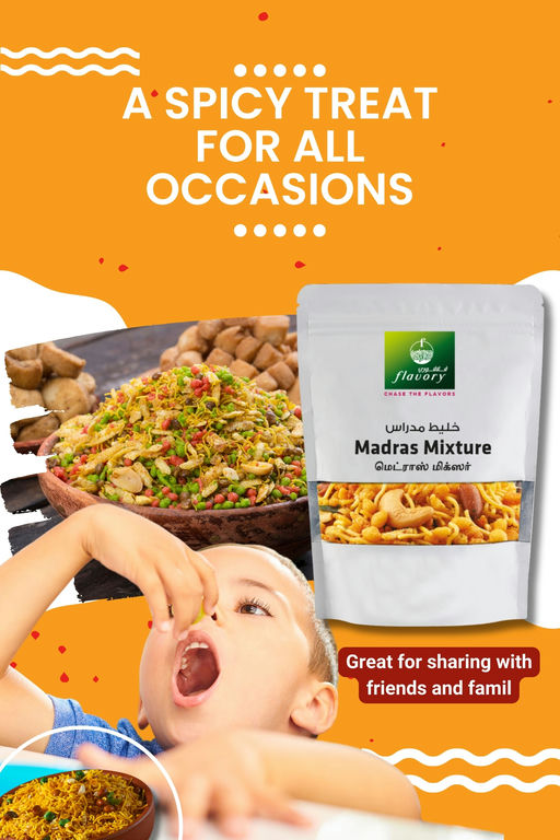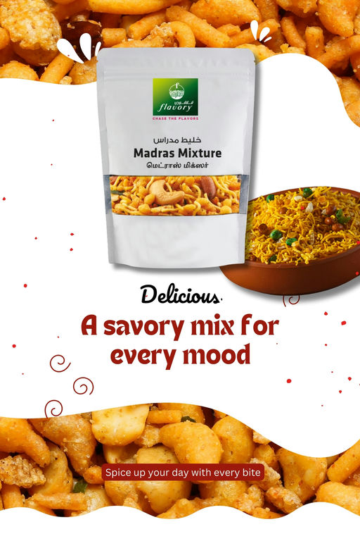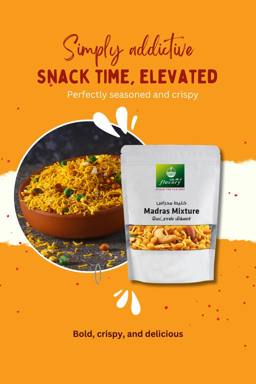 Flavory Madras Mixture is a delicious South Indian snack made with a mix of lentils, nuts, and spices. This savory and spicy treat offers a perfect combination of crispy textures and bold flavors in every bite. Deep-fried to a golden crunch, it’s seasoned with a special blend of spices, providing a satisfying spicy kick. Handcrafted using traditional methods, this mixture is perfect for tea time, festivals, or as a savory snack throughout the day. Flavory Madras Mixture brings the authentic taste of South India to your home, offering a flavorful snack experience.
