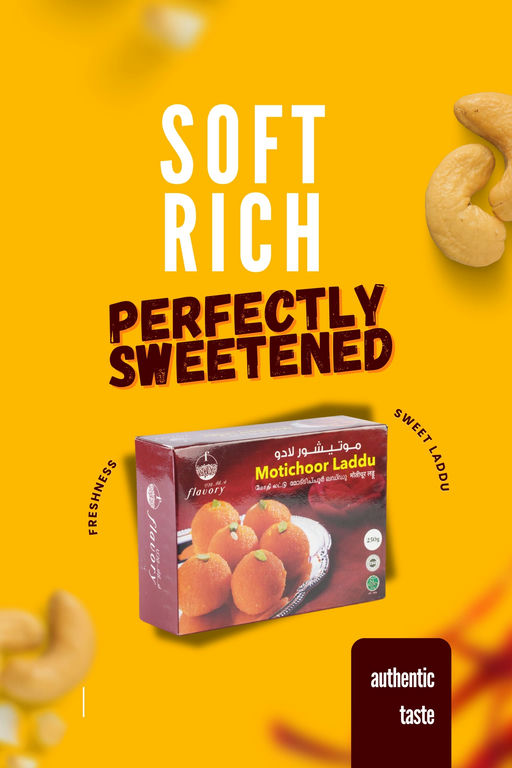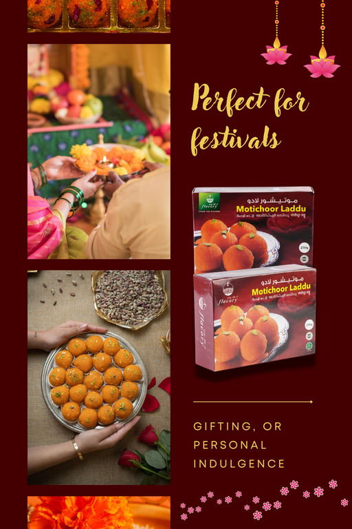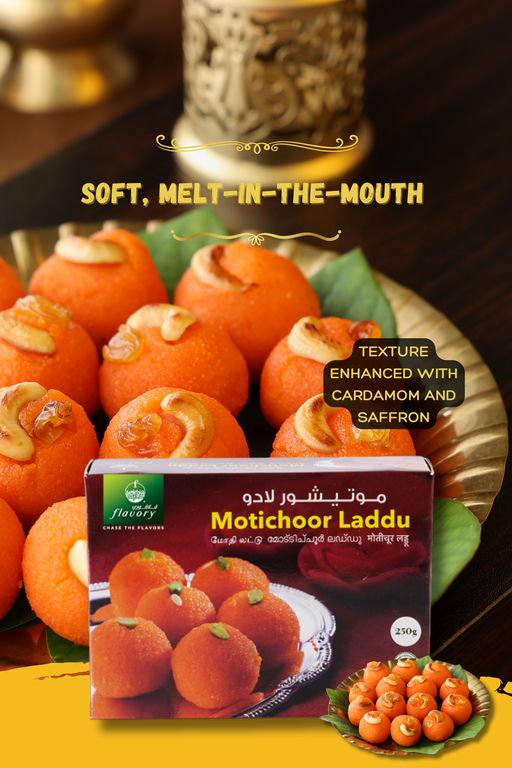 Flavory Mothichoor Laddu is a traditional Indian sweet known for its rich flavor and melt-in-the-mouth texture. Made with the finest ingredients, including besan (gram flour), pure ghee, and sugar, these laddus offer the perfect blend of sweetness and fragrance. A beloved treat during festivals, celebrations, or as an everyday indulgence, Flavory Mothichoor Laddu is handcrafted to maintain authenticity and deliver exceptional taste. Enjoy these laddus as a sweet snack or share them with loved ones during special occasions.