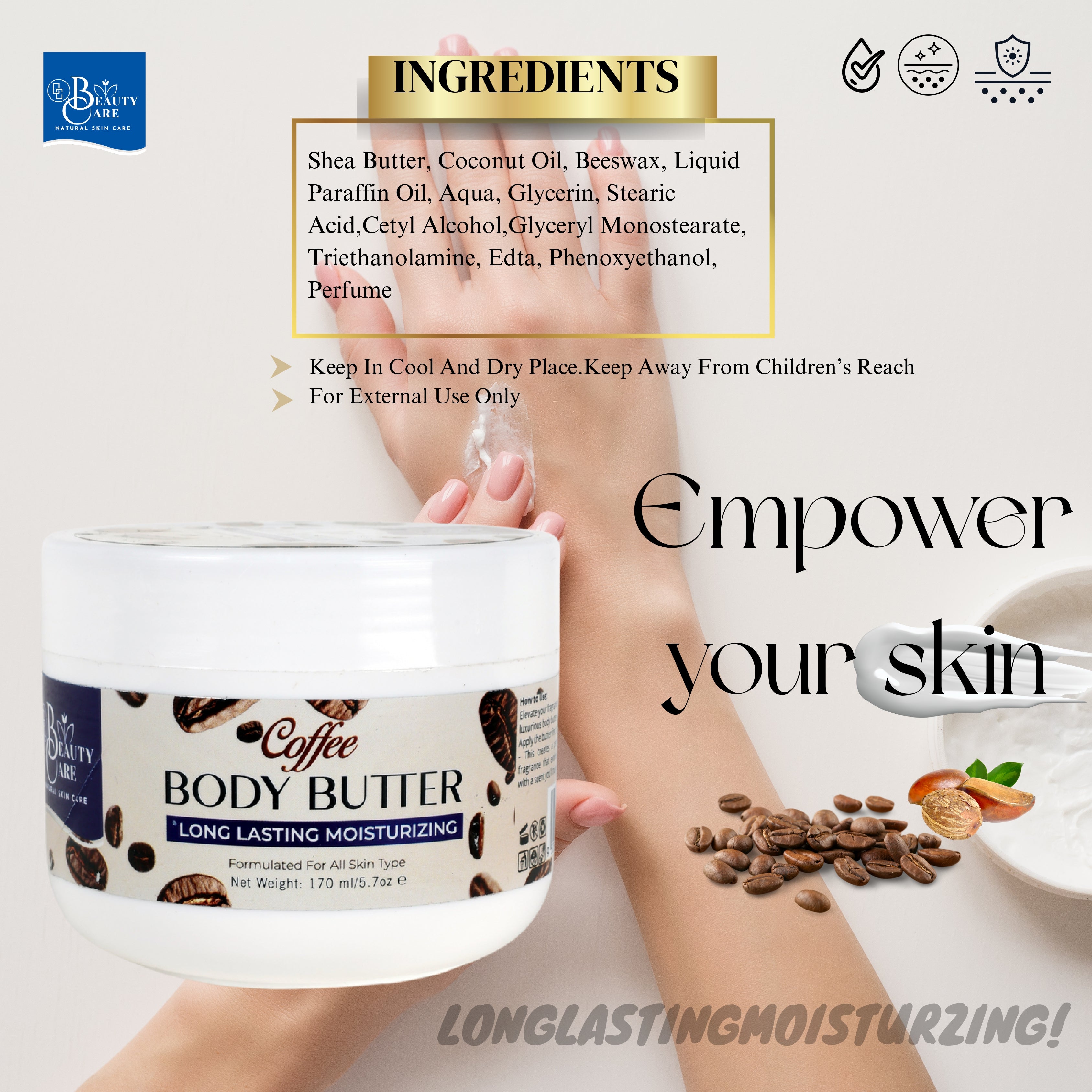 Indulge your skin in the rich, aromatic luxury of GC Beauty Care Coffee Body Butter. Infused with antioxidant-rich coffee extract, this ultra-nourishing body butter deeply hydrates, softens, and revitalizes your skin with every use. Its creamy, non-greasy texture melts effortlessly into the skin, delivering long-lasting moisture that leaves you feeling smooth, pampered, and glowing.Perfect for all skin types, this body butter not only moisturizes but also brightens and softens dull, dry skin, revealing a healthier, more radiant look. The irresistible coffee scent provides a gentle pick-me-up, leaving your skin smelling as good as it feels.Whether you're starting your day or winding down, GC Beauty Care Coffee Body Butter is your daily dose of self-care—because your skin deserves to feel good, smell amazing, and shine naturally.