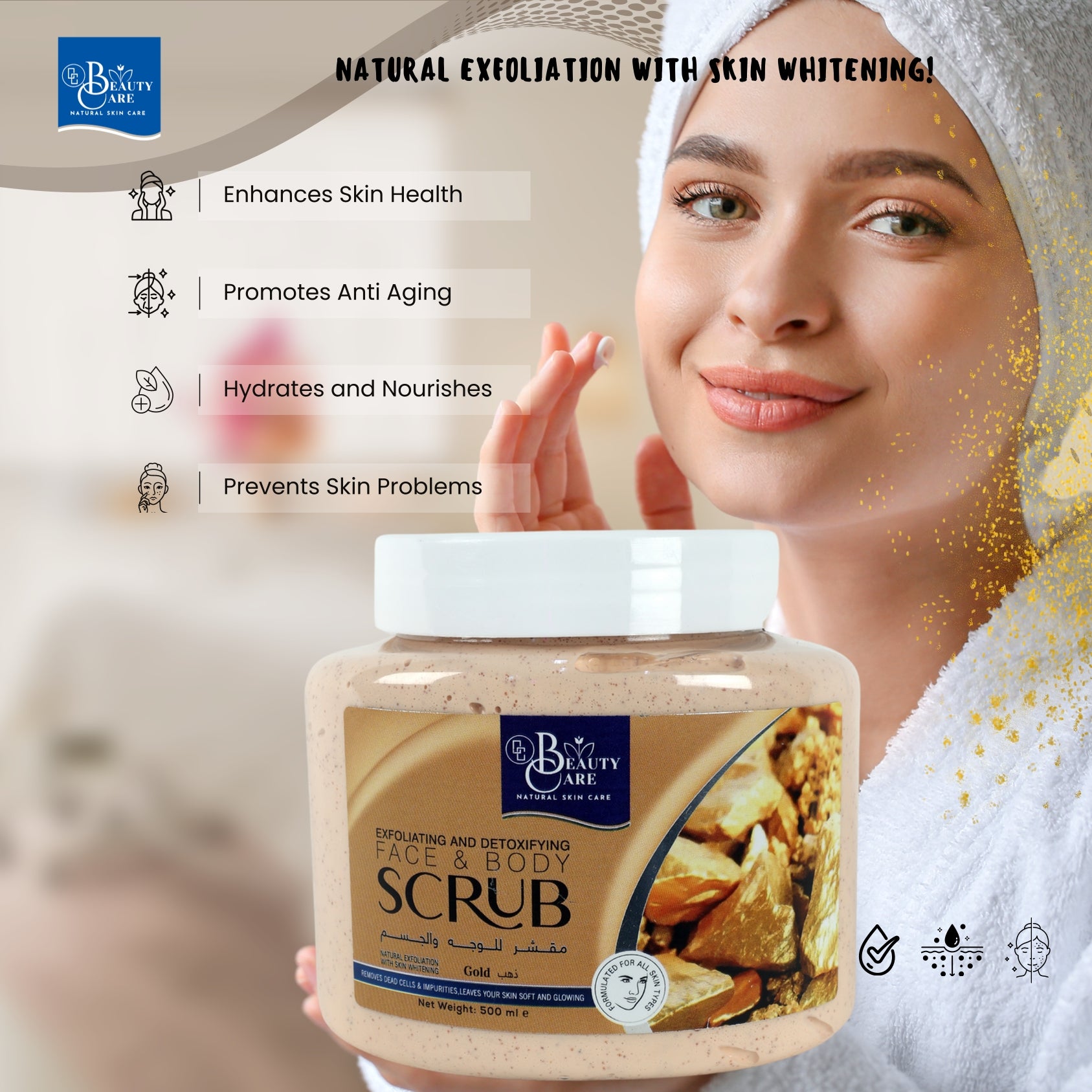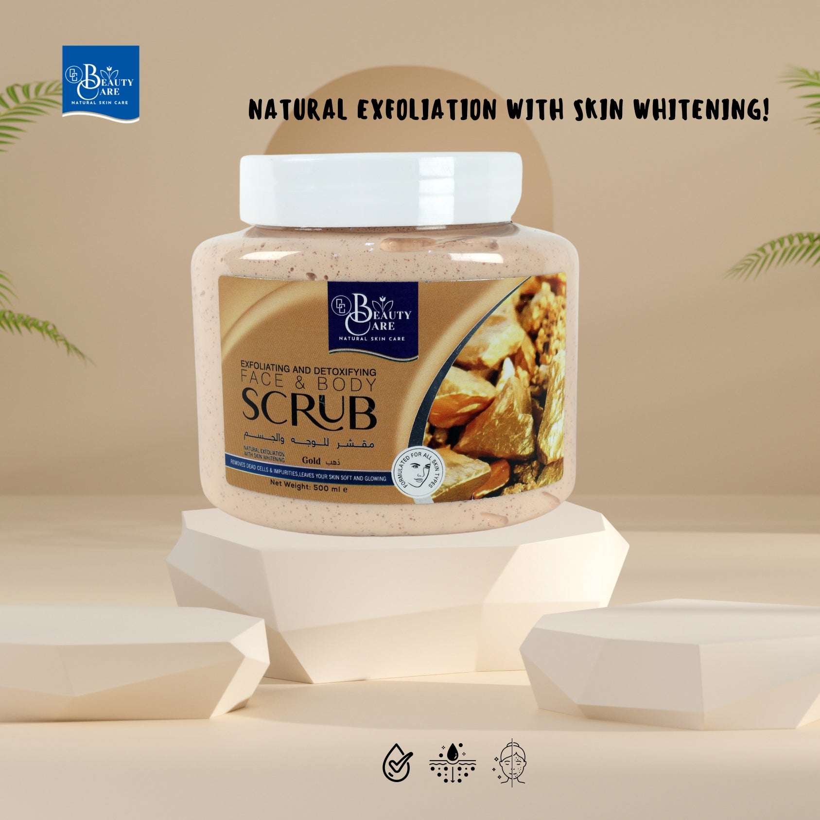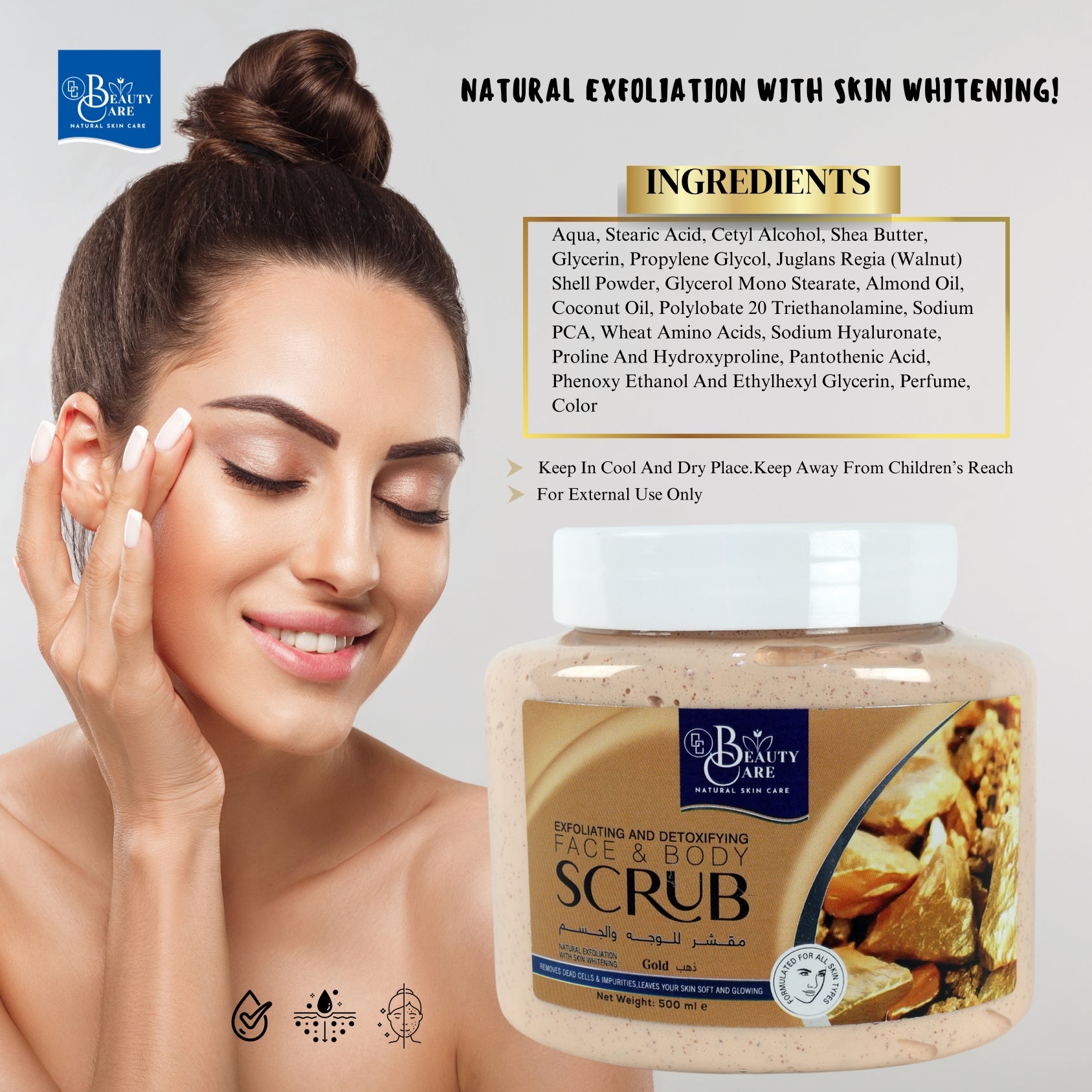 Indulge your skin in the luxurious benefits of GC Beauty Care Exfoliating & Detoxifying Face & Body Scrub – Gold. This premium scrub is infused with real gold particles, helping to brighten and rejuvenate your skin, leaving it with a glowing, radiant appearance.Designed for all skin types, it provides natural exfoliation, effectively removing dead skin cells and impurities. The skin whitening effect works to lighten dark spots and even out your skin tone, promoting a more luminous complexion.Hydrating and nourishing, this scrub ensures your skin remains soft, smooth, and deeply moisturized while exfoliating. Ideal for both face and body, GC Beauty Care Gold Scrub is the perfect treatment for glowing, refreshed skin.