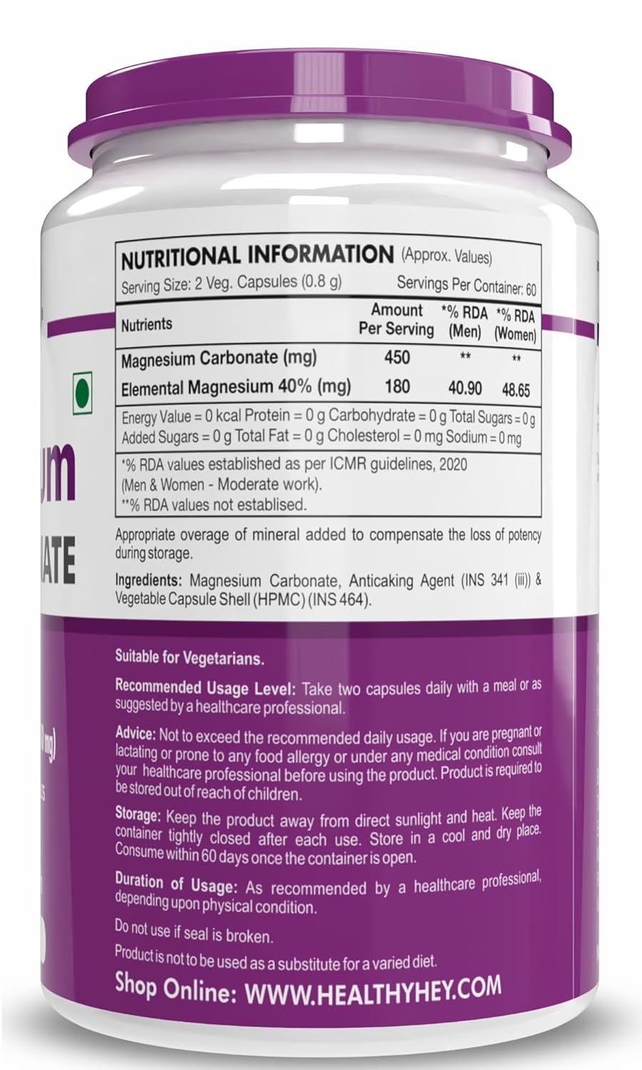 HealthyHey Nutrition Magnesium Carbonate 450mg - 120 Vegetable Capsules
