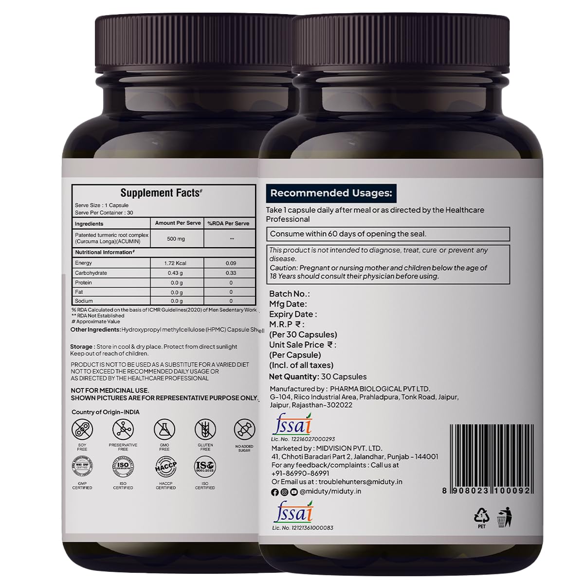Harness the power of curcumin with Miduty's advanced turmeric formula, engineered to deliver maximum bioavailability. This premium blend combines turmeric's potent antioxidant properties with a specialized matrix designed for optimal absorption. Curcumin works to combat inflammation at the cellular level while supporting your body's natural defense mechanisms. Beyond inflammation management, this formulation offers anti-aging benefits through its powerful antioxidant action. Each capsule provides a concentrated dose of nature's most researched anti-inflammatory compound. Ideal for those seeking joint support, immune enhancement, and overall wellness. 30 vegetarian capsules per bottle.