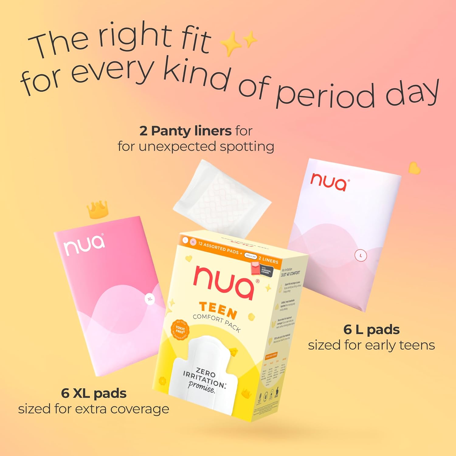 Nua Teen Comfort Sanitary Pads for Teens | Sanitary Pads 14 Count (12 Pads + 2 Liners)