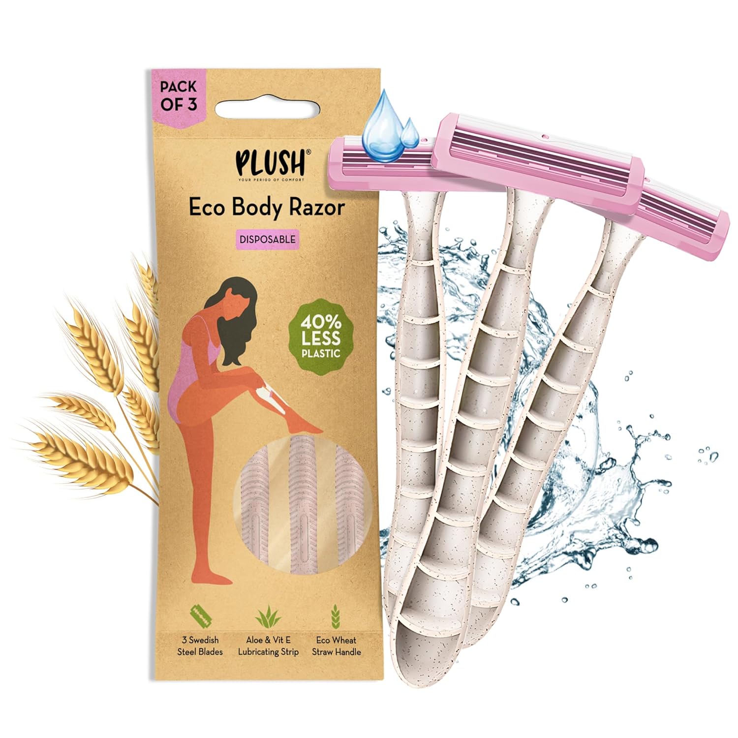 Achieve effortless, irritation-free hair removal with our Plush Eco Disposable Body Razor. Each set includes three razors featuring Swedish steel blades for a smooth, close shave every time. The aloe and vitamin E lubricating strip nourishes your skin while you shave, reducing irritation and leaving your skin feeling soft and hydrated. Crafted with an eco-conscious wheat straw handle, these razors combine sustainability with performance. Perfect for women seeking a gentle yet effective shaving solution that cares for both your skin and the environment.