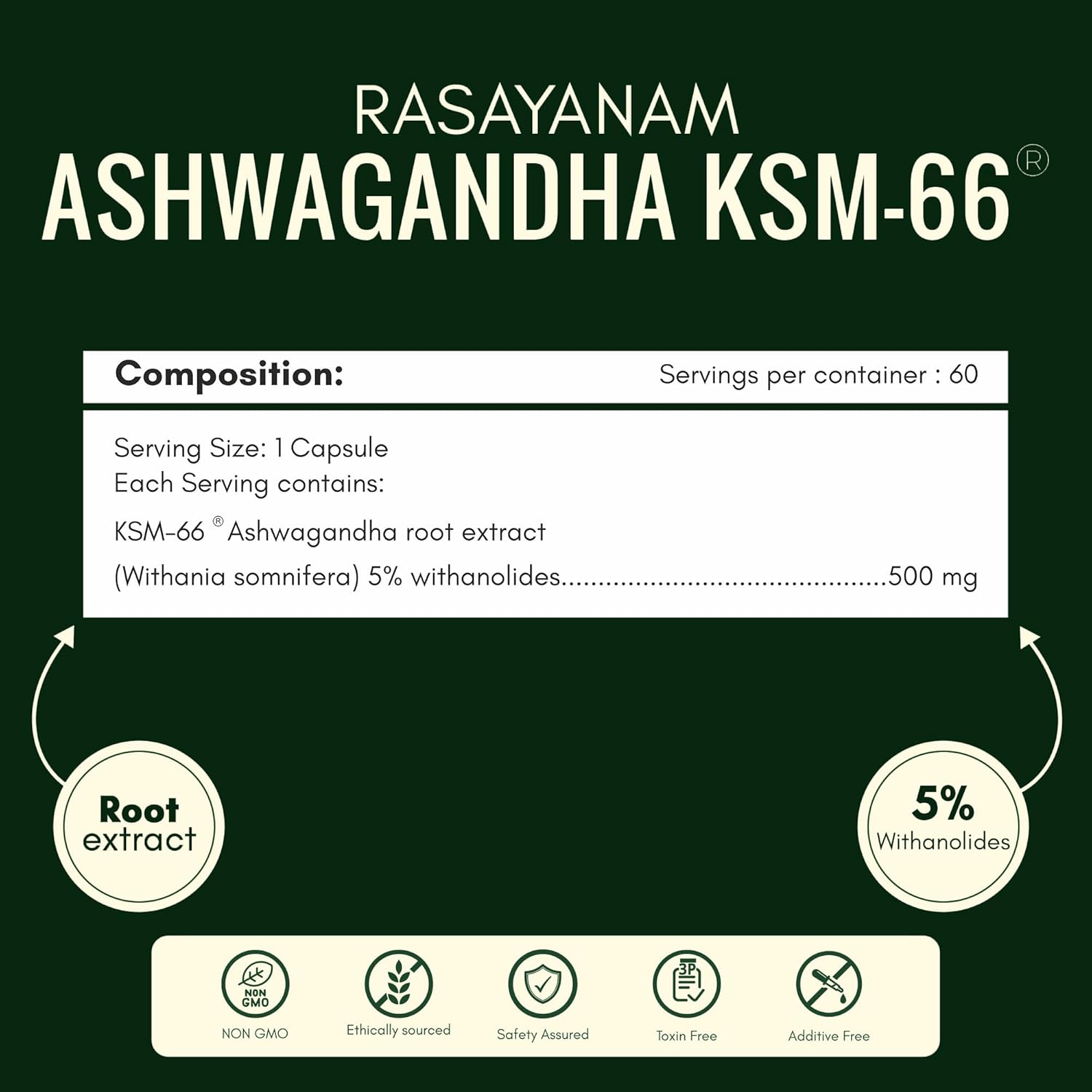 Rasayanam Ashwagandha KSM-66 delivers a full-spectrum extract from Withania Somnifera roots, backed by 14 years of research and 24 clinical trials. Each capsule provides standardized support for stress management and mental clarity. This 100% natural formulation helps promote emotional balance and cognitive function, making it an ideal choice for those seeking evidence-based wellness support. With 60 capsules per bottle, it offers a convenient way to integrate this traditionally valued adaptogen into your daily routine.