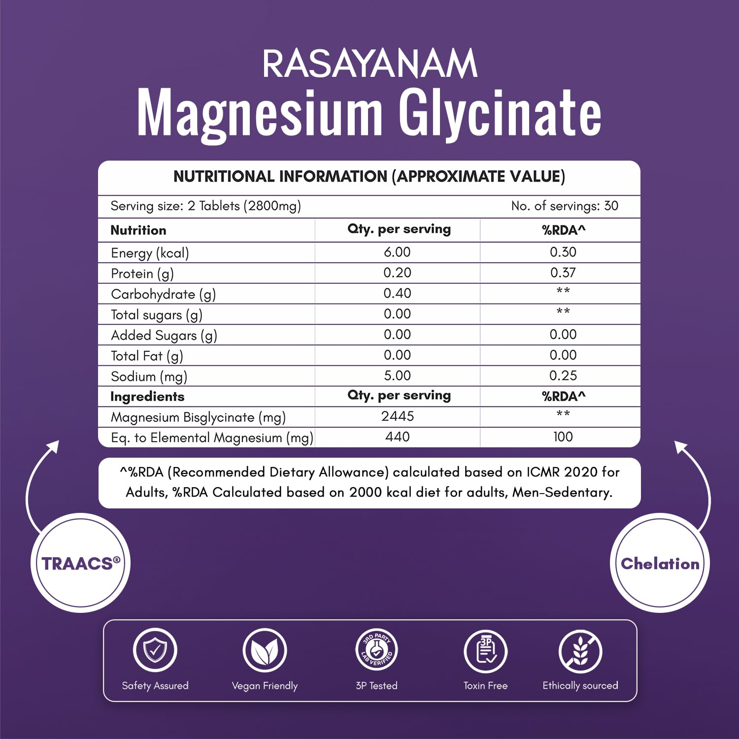 Rasayanam Chelated Magnesium Glycinate (2445 mg) - 60 Tablets