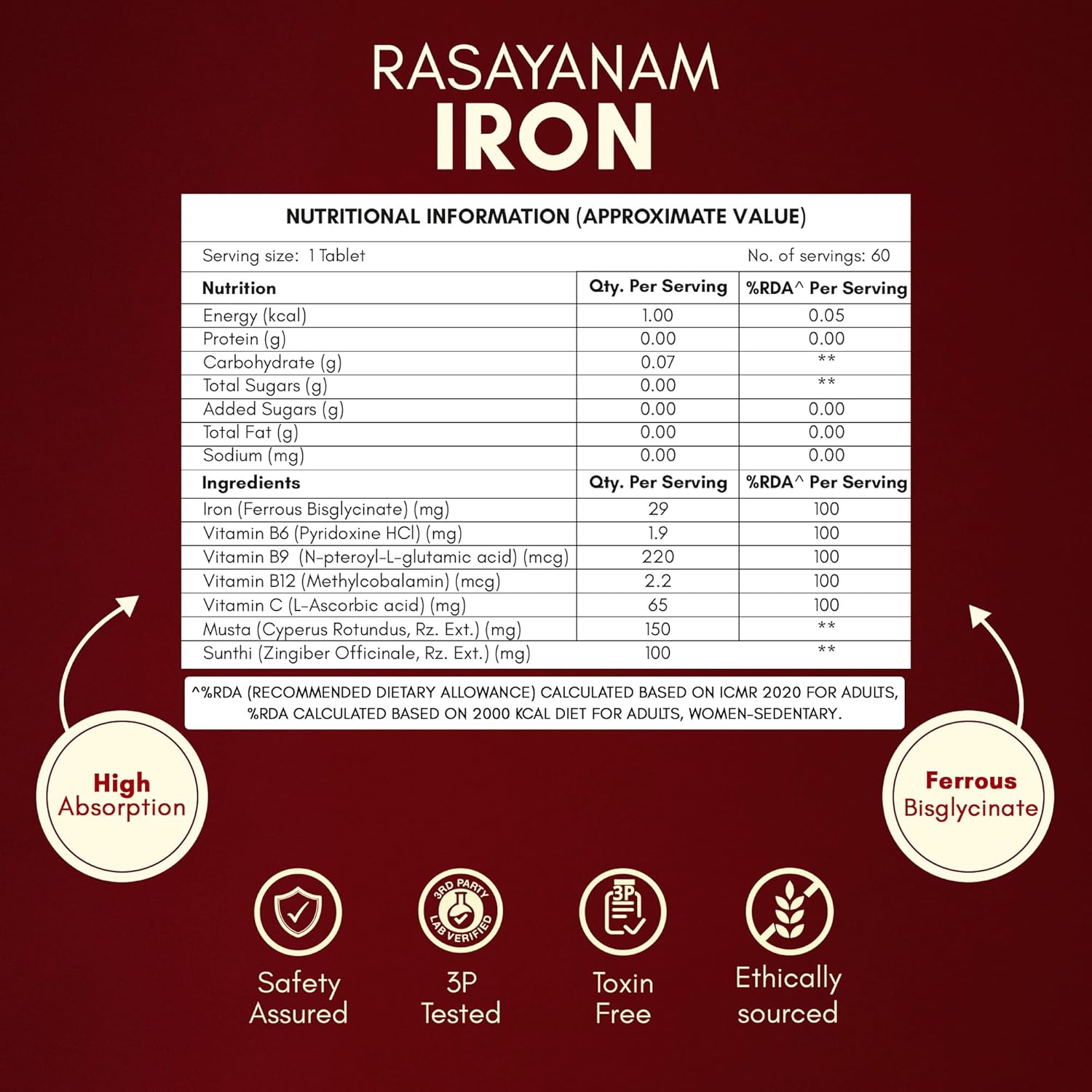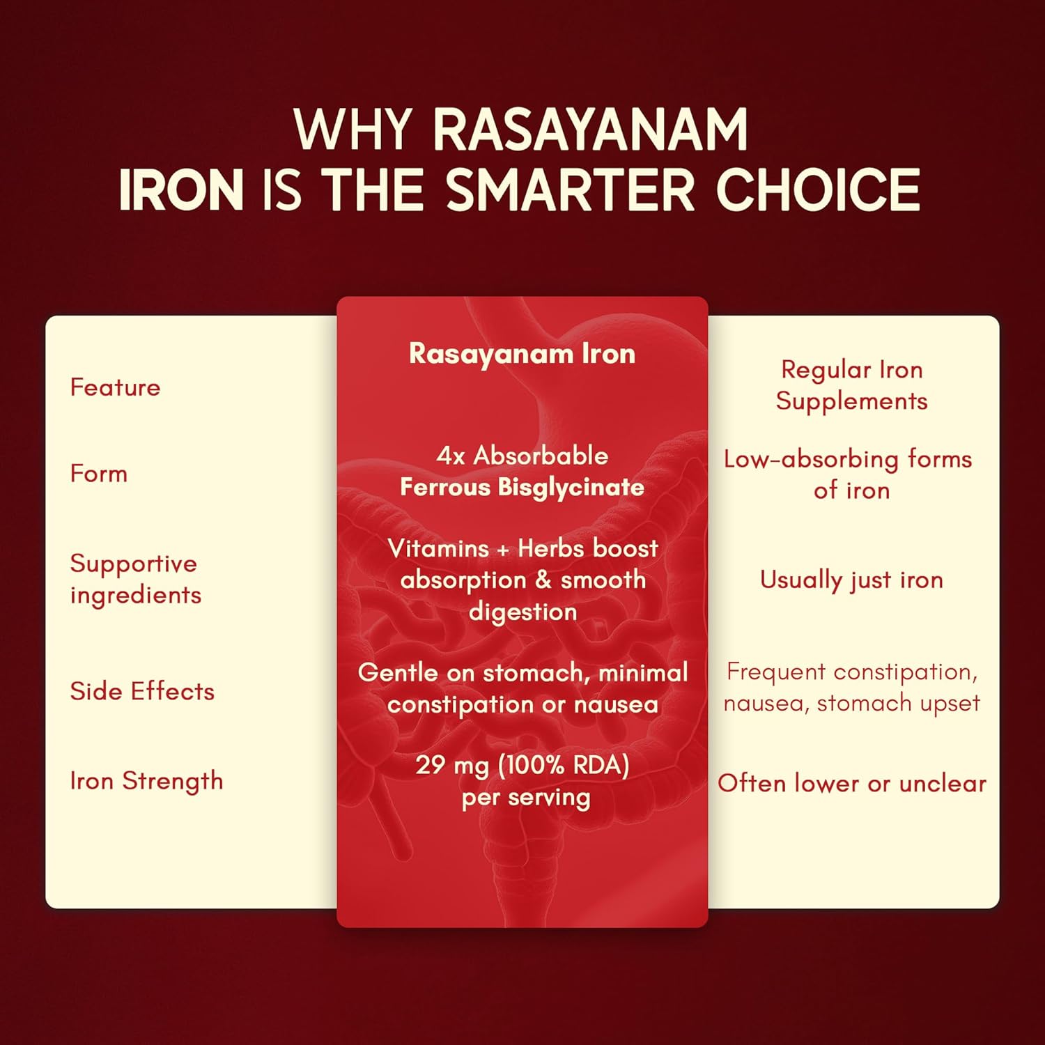 Rasayanam Iron Supplement delivers superior bioavailability through Ferrous Bisglycinate, a chelated iron form clinically proven to absorb four times more... Read more