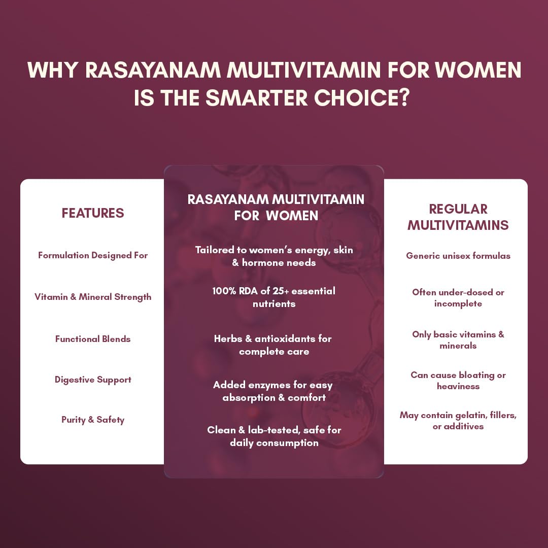 Rasayanam Multivitamin delivers comprehensive nutritional support with 55 scientifically-selected ingredients formulated specifically for women's health. Each tablet provides 100% RDA... Read more