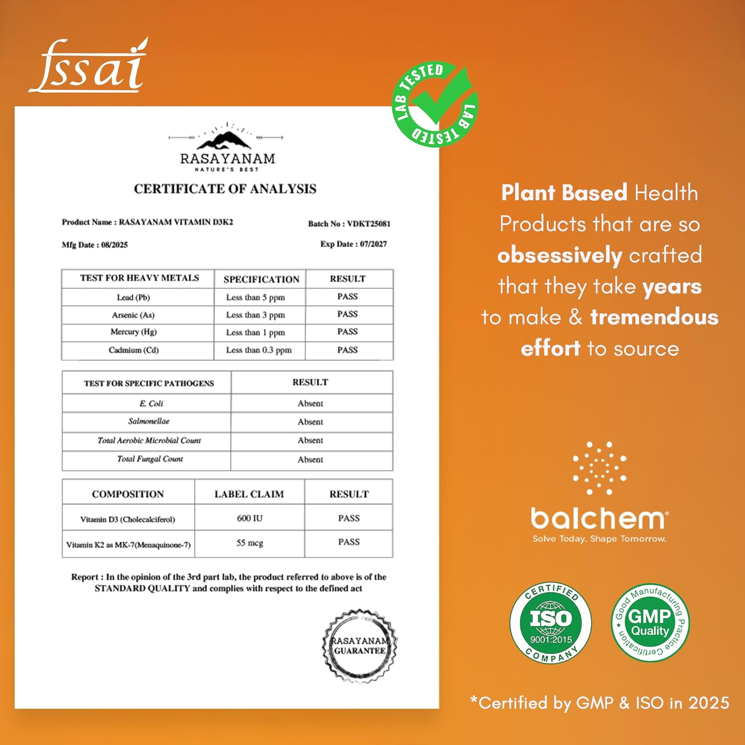 Rasayanam Vitamin D3 K2 delivers 600 IU of plant-based Vitamin D3 from lichen plus 55 mcg of Vitamin K2 (MK-7) per tablet, meeting 100% of the adult RDA. This synergistic combination supports optimal calcium absorption and bone mineralization while promoting cardiovascular health by directing minerals to skeletal tissue rather than arterial deposits. Ideal for vegans and those seeking comprehensive bone support without animal-derived ingredients.
